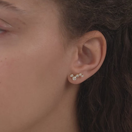 Meticulously crafted in brilliant Gold, the earring showcases five round brilliant diamonds, each secured in a sleek and protective Bezel Setting. The diamonds are staggered in a contemporary, asymmetrical cluster, maximizing their combined fire and light.