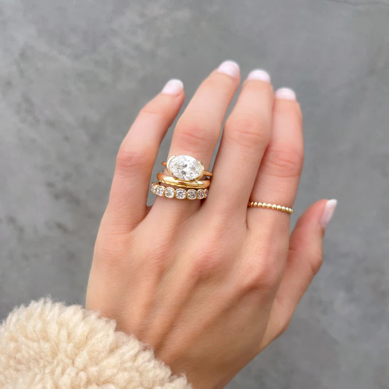 Introducing a refined classic with a modern twist: the East-West Oval Solitaire. This captivating ring takes the beloved Oval Cut diamond—celebrated for its superior brilliance and flattering shape—and sets it horizontally in a secure, streamlined Half Bezel.