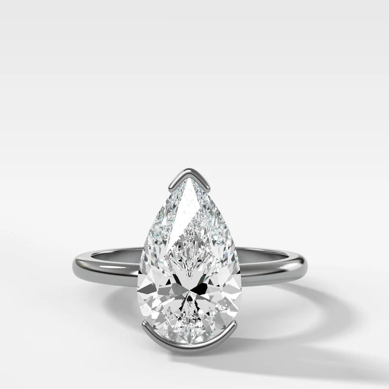 The Pear Cut is cherished for its soft, brilliant facets and unique, asymmetrical silhouette, which naturally elongates the finger when worn in the traditional North-South (vertical) orientation. Setting this shape in a Half Bezel is a masterstroke of design: the metal embraces the diamond's two curved sides, securely shielding the delicate point (the tip) where it is most vulnerable to impact. This gives the ring a clean, contemporary profile, minimizing snagging while ensuring the stone is kept safe for everyday wear. The Half Bezel allows the maximum amount of light to enter the crown of the stone, ensuring a dramatic, fiery sparkle.