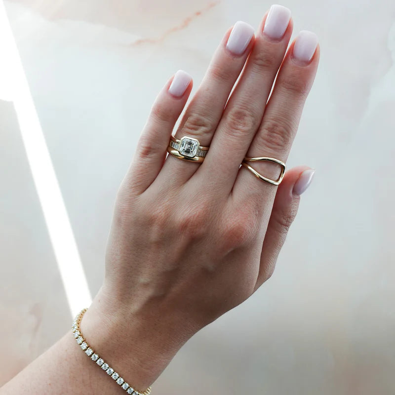 The Asscher Cut is celebrated for its precise, architectural geometry and the mesmerizing "Hall of Mirrors" effect created by its step-cut facets. Its square shape and deep corners demand an equally confident and structured setting. The Penumbra Bezel provides exactly this: a complete metal border that fully wraps the stone's delicate girdle, offering the ultimate protection against daily knocks and wear. Unlike traditional bezel settings, the 'Penumbra' style is crafted with a very low, streamlined profile, allowing maximum light into the stone's crown while maintaining a clean, contemporary aesthetic. This setting ensures the Asscher's clarity and proportions are the undisputed focal point.