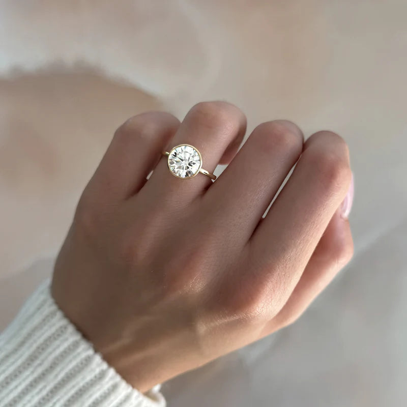 The Round Brilliant Cut sets the standard for sparkle, with 58 facets expertly engineered to maximize light return. When set in a Penumbra Bezel, the ring achieves its most secure form. The continuous metal border fully wraps the stone's delicate girdle, offering 360-degree security against chipping, knocks, and daily impacts. The 'Penumbra' style is purposefully crafted with a very low, streamlined profile, ensuring exceptional comfort and a completely snag-free experience, making it the ideal choice for nurses, doctors, artists, or anyone with an active lifestyle.